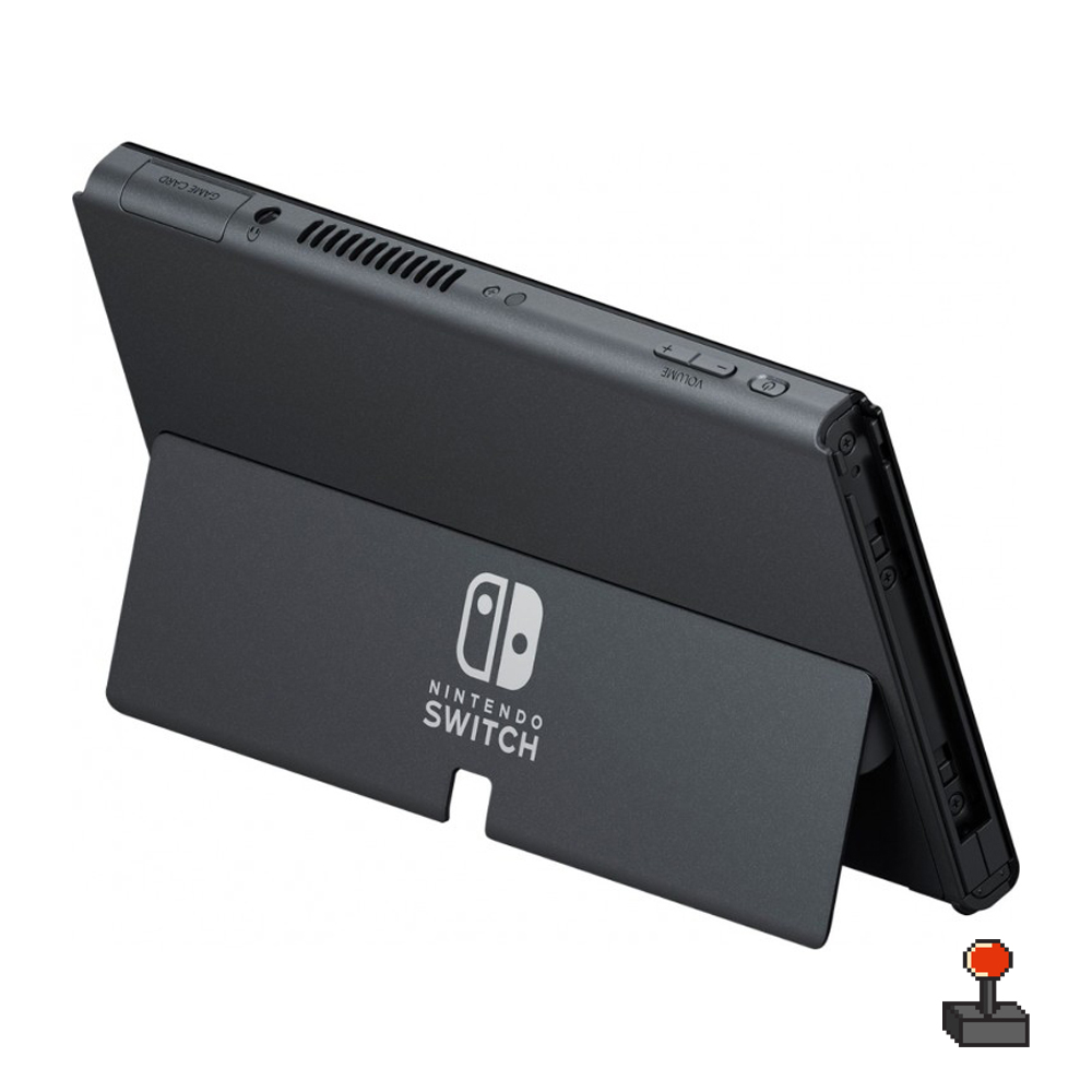 علاوه بر این، دکمه روشن وخاموش کنسول و دکمههای کنترل صدای آن نیز در بالای کنسول قرار دارند و در سمت راست آنها جک 3.5 میلیمتری برای اتصال هدست تعبیه شده است. در پایین کنسول، یک کابل USB تایپ C قرار دارد که علاوه بر اتصال به داک، میتوان با استفاده از آن، کنسول را مستقیما به هر منبع برقی وصل کرد.مدل OLED کنسول نینتندو سوییچ دارای یک پایه رومیزی بزرگتر است که دوام و استحکام بیشتری نسبت به مدل اولیه دارد. با بازکردن این پایه، محل قرار دادن کارت میکرو SD دیده میشود.