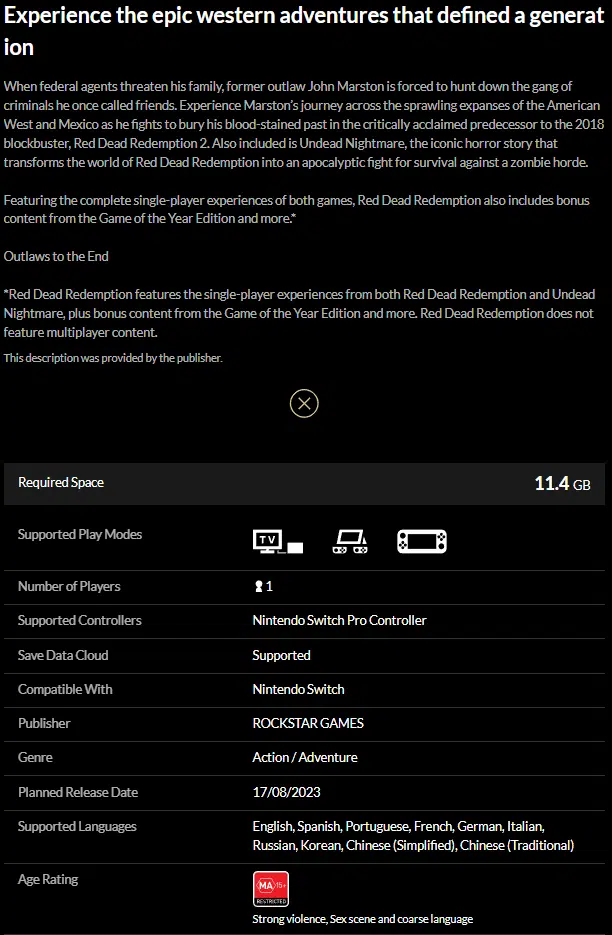 Red Dead Redemption Revision به دلایل متعدد برای بسیاری از طرفداران ناامید کننده نیست، اما یکی از دلایل آن فضا نخواهد بود. طبق گفته فروشگاه نینتندو ، این عنوان 11.4 گیگابایتی ناچیز خواهد بود .